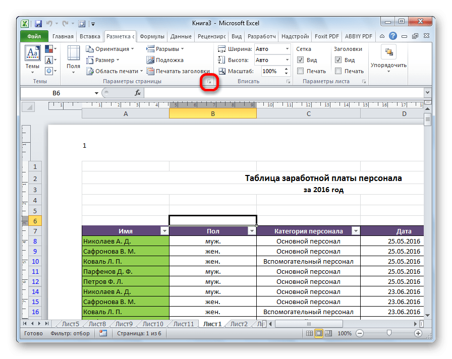На ленте есть значок наклонной стрелки в левом нижнем углу панели инструментов «Параметры страницы». Щелкаем по ней.
