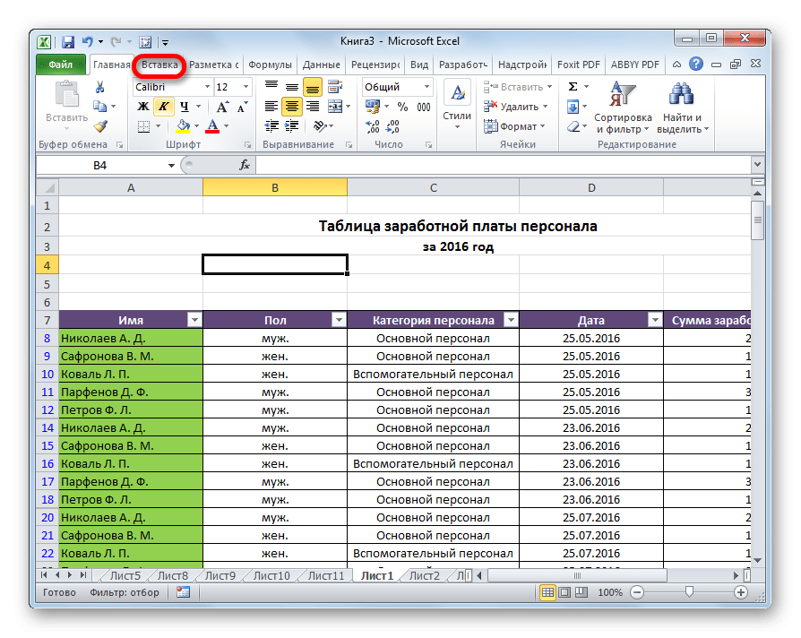 Левой кнопкой мыши кликаем на лист Excel, страницы которого нужно пронумеровать. Открываем в главном меню «Вставка», далее – «Колонтитулы».