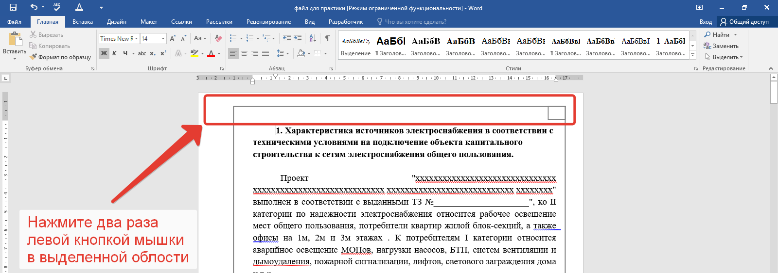 - Сейчас перебегаем в режим редактирования верхнего колонтитула нажимая двойным щелком левой клавиши мышки в верху документа, приблизительно тут: