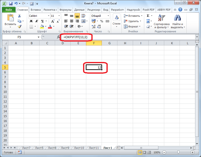 Для функций ОКРУГЛТ, ОКРВВЕРХ и ОКРВНИЗ применяется такая формула округления: «Наименование функции(число;точность)». Например, чтобы округлить число 11 до ближайшего числа кратного 2, вводим функцию ОКРУГЛТ(11;2). На выходе получается число 12.
