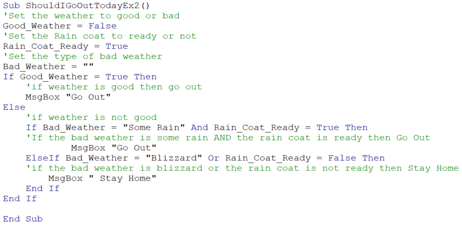 If Bad_Weather = "Some Rain" And Rain_Coat_Ready = True Then