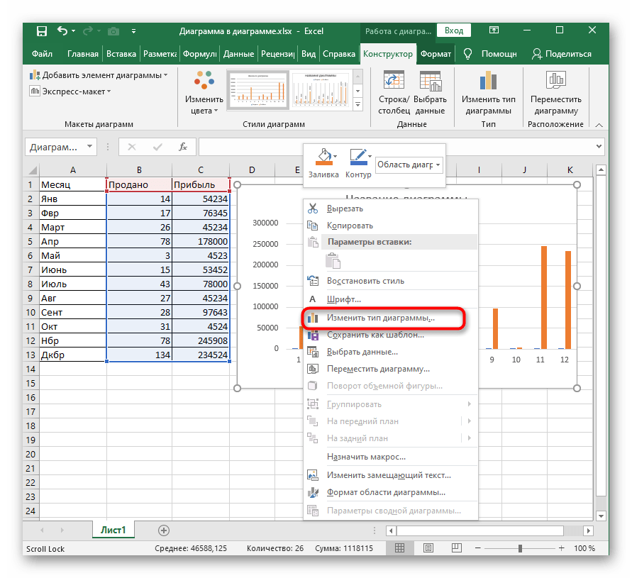 С помощью вкладки «Конструктор» можно изменить тип и стиль диаграммы, переместить график на отдельный лист Excel, выбрать диапазон данных для отображения на графике.