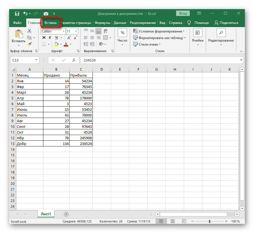 - Сначала выберите абсолютно любой блок ячеек, а затем создайте диаграмму стандартным образом.