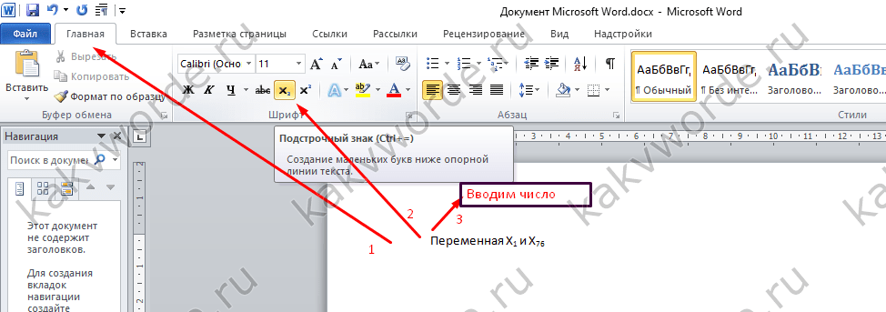 Вероятно, продвинутый пользователь приметил горячую клавишу для нижнего индекса, но если нет, то давайте разберём этот вопрос. Всё на той же основной панели Ворда, имеется вкладка «Главная», на ней расположились две кнопки – Х 2 и Х 2 . В данном случае, рассмотрим Х 2 . С помощью этой кнопки просто напечатать любую переменную, порядок действий ничем не отличается от выше разобранного варианта. Меняется второй шаг, вместо знака Х 2 (который позволит написать цифру над числом или буквой) на основной панели, выбираем знак Х 2 т.е. «Подстрочный знак» (с помощью которого написать нижний индекс можно за секунду). Внимательно рассмотрим на примере ниже все шаги по очереди.