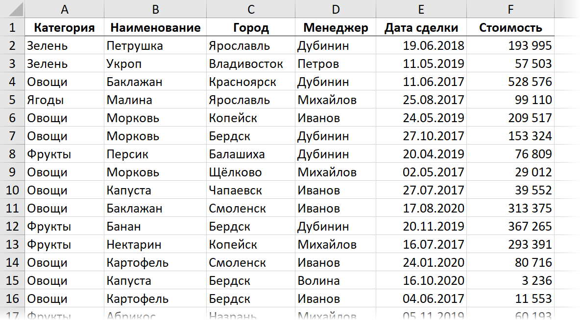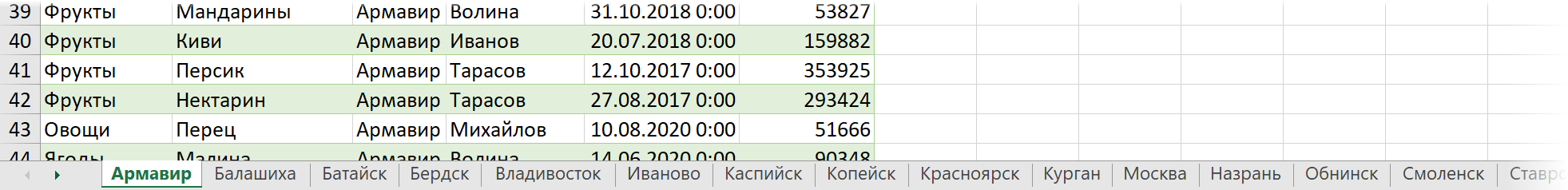 Задача: разнести данные из этой таблицы по городам на отдельные листы этой книги. Т.е. на выходе нужно получить на каждом листе только те строки из таблицы, где продажа была в соответствующем городе: