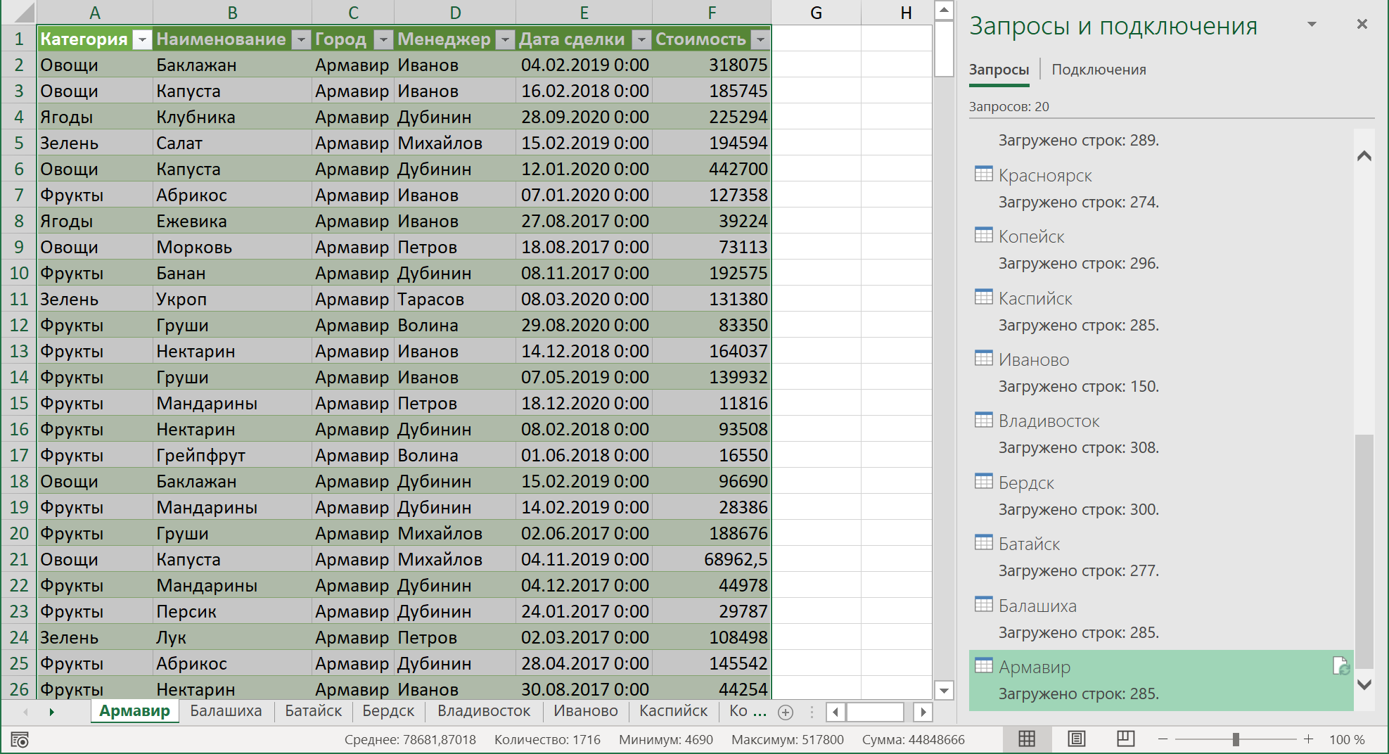 После его запуска мы увидим те же листы по городам, но формировать их будут уже созданные запросы Power Query: