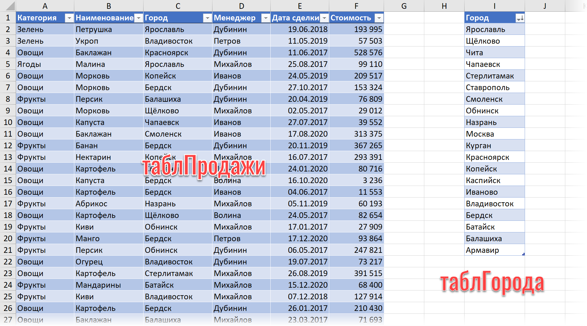 Во-вторых, преобразуем обе таблицы в динамические («умные»), чтобы с ними было проще работать. Используем команду Главная — Форматировать как таблицу (Home — Format as Table) или сочетание клавиш Ctrl + T . На появившейся вкладке Конструктор (Design) назовём их таблПродажи и таблГорода, соответственно:
