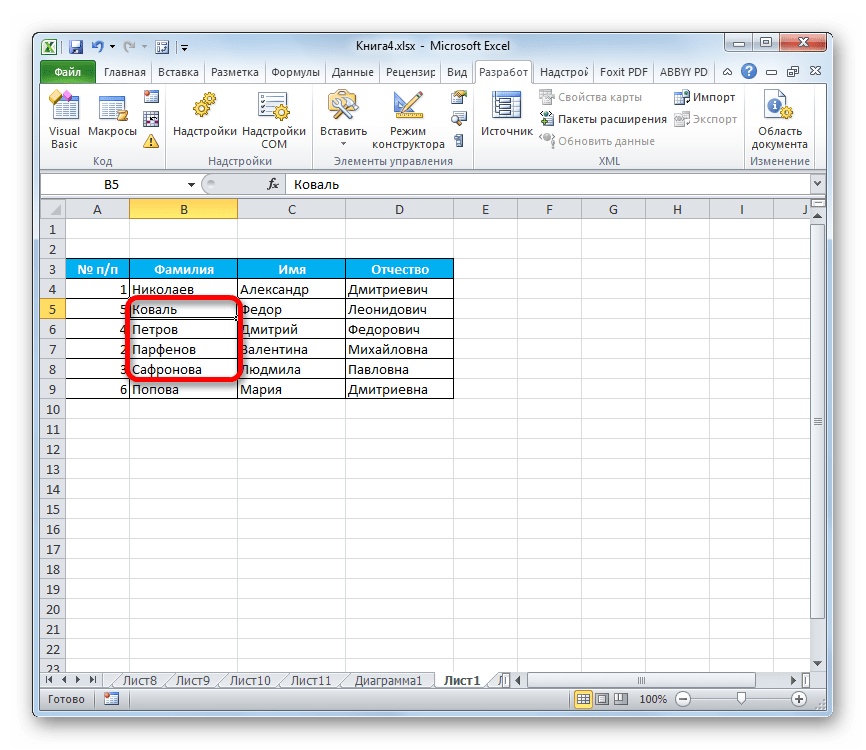 После этого действия макрос автоматически меняет содержимое выделенных ячеек местами.