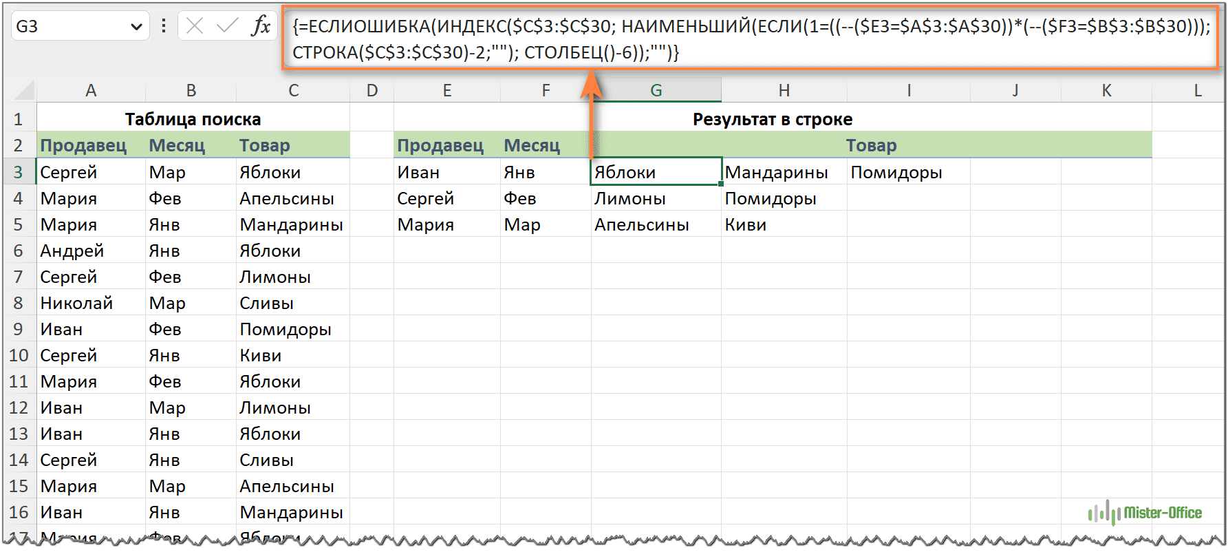 Таким образом, мы вводим имя в E3, месяц в F3, и получаем список товаров в столбце G: