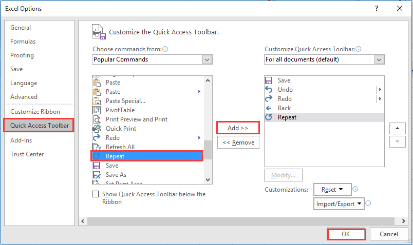 2. в Параметры Excel диалоговое окно, выберите Повторить в поле команд и щелкните Добавить , затем нажмите OK кнопка. Смотрите скриншот:
