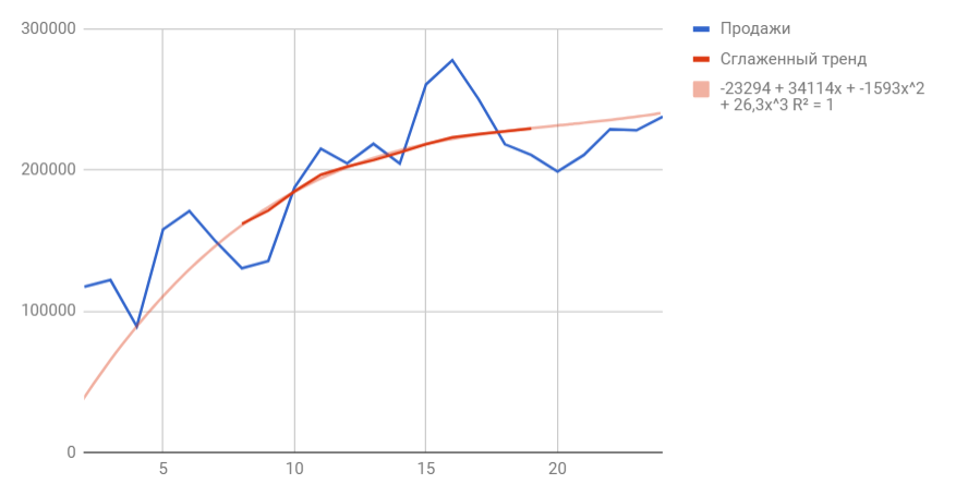 В качестве сглаженной я выбрала полином третьей степени, так как он лучше всего описывал уровни временного ряда и имел наибольший R^2.