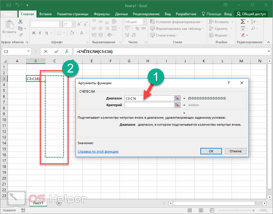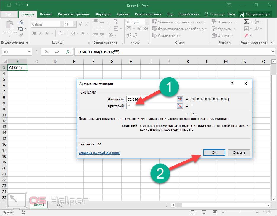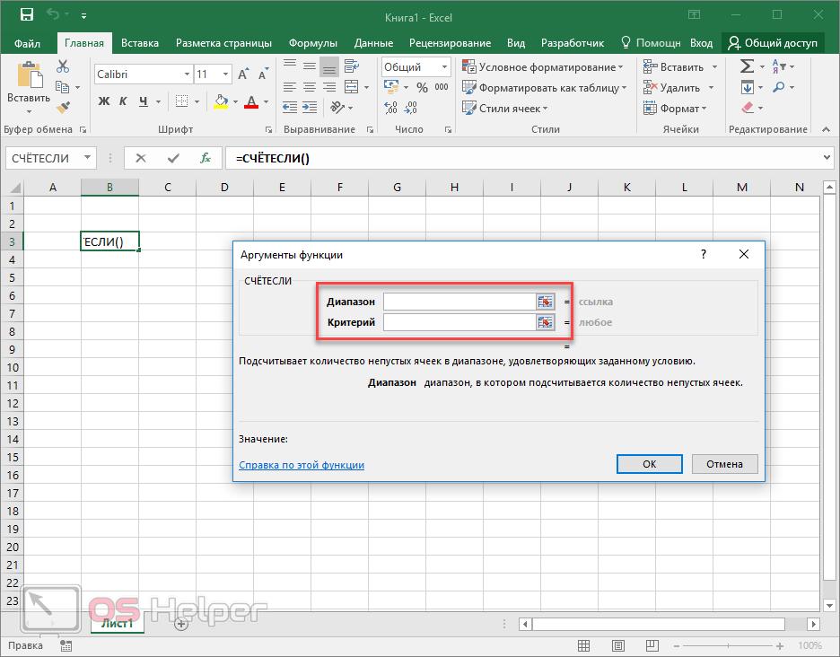 - После этого вас попросят указать «Аргументы функции». Поля будут всегда меняться в зависимости от выбранной формулы. В данном случае нужно указать диапазон ячеек и критерий для подсчета.