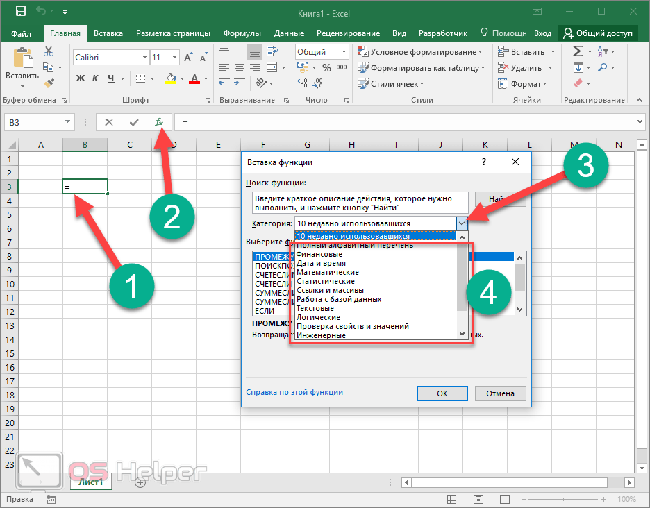 - Выберите любую ячейку. Нажмите на иконку вызова окна «Вставка функции». Кликните на выпадающий список и выберите нужную категорию.