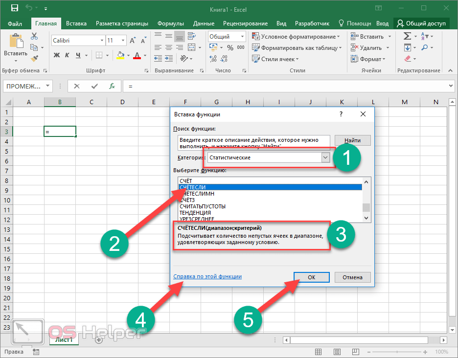 - Затем выберите желаемую функцию. В качестве примера рассмотрим «СЧЁТЕСЛИ». Сразу после этого вы увидите короткую информацию о выбранном пункте. Для подробной справки нужно будет кликнуть на указанную функцию. Для продолжения необходимо нажать на «OK».