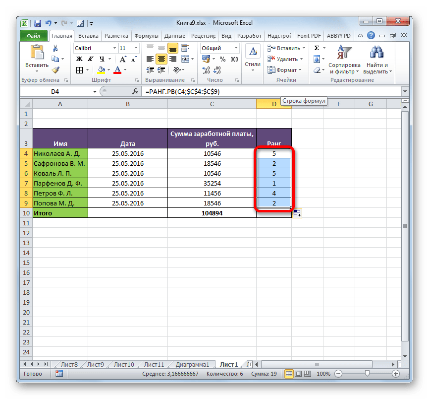Используем для ячейки C2 формулу =РАНГ(B2;$B$2:$B$7;0), для ячейки D2 – формулу =РАНГ.РВ(B2;$B$2:$B$7;0), а для ячейки E2 – формулу =РАНГ.СР(B2;$B$2:$B$7;0). Протянем все формулы на ячейки ниже.