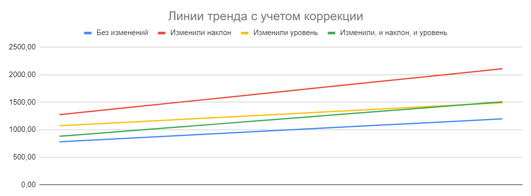 Таким образом, мы можем изменять наклон и уровень тренда, как в отдельности, так и одновременно (подробнее в примере):
