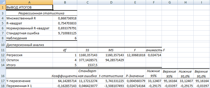 R-квадрат – коэффициент детерминации. В нашем примере – 0,755, или 75,5%. Это означает, что расчетные параметры модели на 75,5% объясняют зависимость между изучаемыми параметрами. Чем выше коэффициент детерминации, тем качественнее модель. Хорошо – выше 0,8. Плохо – меньше 0,5 (такой анализ вряд ли можно считать резонным). В нашем примере – «неплохо».