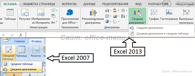 Для построения сводной диаграммы с нуля необходимо на вкладке «Вставка» выбрать соответствующий значок. Для приложения 2013 года он находиться в группе «Диаграммы», для приложения 2007 года в группе таблицы, пункт раскрывающегося списка «Сводная таблица».