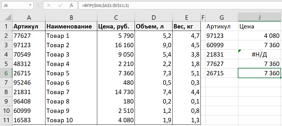 Номер столбца – то, что нужно вернуть. В этом примере требуется вернуть 2 столбец (Товар). Для точного поиска 4 аргумент – .