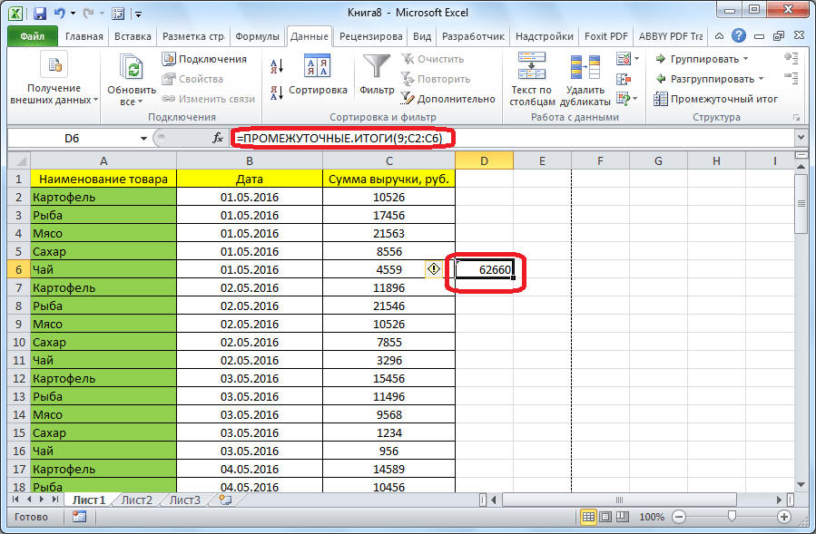 Промежуточные итоги выделенного диапазона данных будут сформированы в ячейке, в которой находится формула.