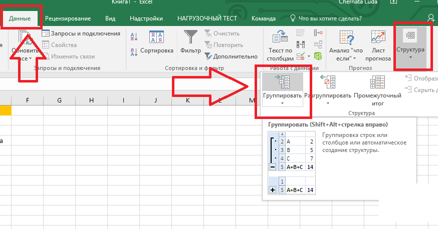 5 Теперь снова выделите столбцы А, В, С и проведите группировку, но уже по столбцам: