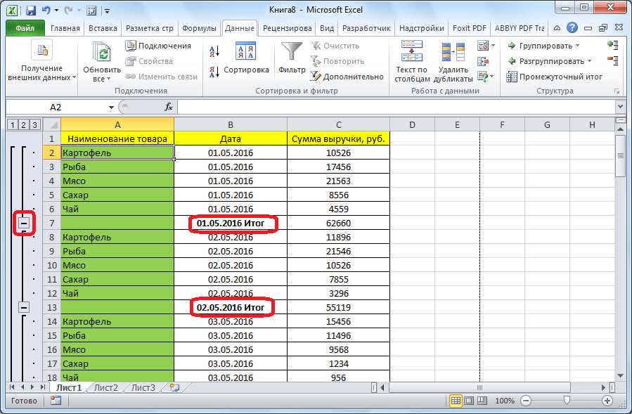 В результате промежуточные итоги появились в нашей таблице. Кроме того, все группы строк, объединенные одним промежуточным итогом, можно свернуть, просто кликнув по знаку «-« слева от таблицы напротив конкретной группы.