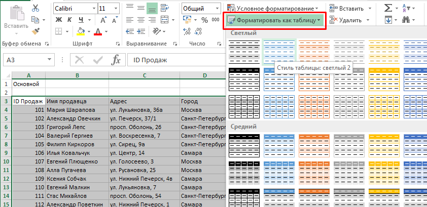 Теперь необходимо превратить данные в настоящую таблицу Excel. Для этого выделяем весь диапазон вместе с заголовками. Переходим во вкладку Главная в группу Стили. Нажимаем кнопку Форматировать как таблицу, из выпадающего меню выбираем стиль, который мы хотим придать таблице.