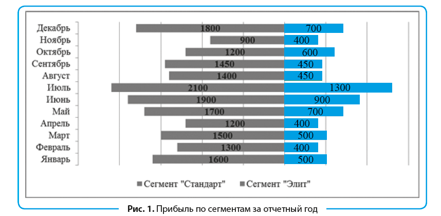 В стандартной линейчатой диаграмме линии направлены в одну сторону. Чтобы линии в диаграмме расходились в разные стороны, нужно, чтобы один из столбцов имел отрицательные значения. На рис. 1 это сегмент «Элит». В таблицу 1 вносят данные по прибыли в столбцы «Сегмент “Стандарт”» и «Сегмент “Элит” Вспом.».