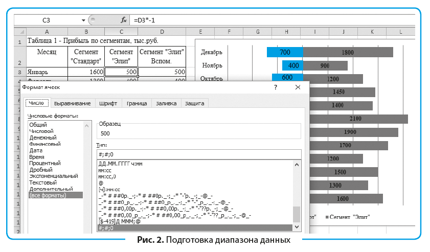 Для построения диаграммы используют зеленый столбец «Элит», где данные из вспомогательного столбца умножены на минус 1. Чтобы скрыть минусы, в Формате ячеек настроен тип «#;#;0» (рис. 2). Это позволит убрать минусы перед числами в таблице и диаграмме, представленной на рис. 1.