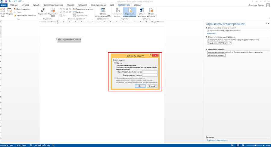 - В разделе «Ограничения на редактирование» из раскрывающегося списка выберите значение «Вводить данные в поля формы».