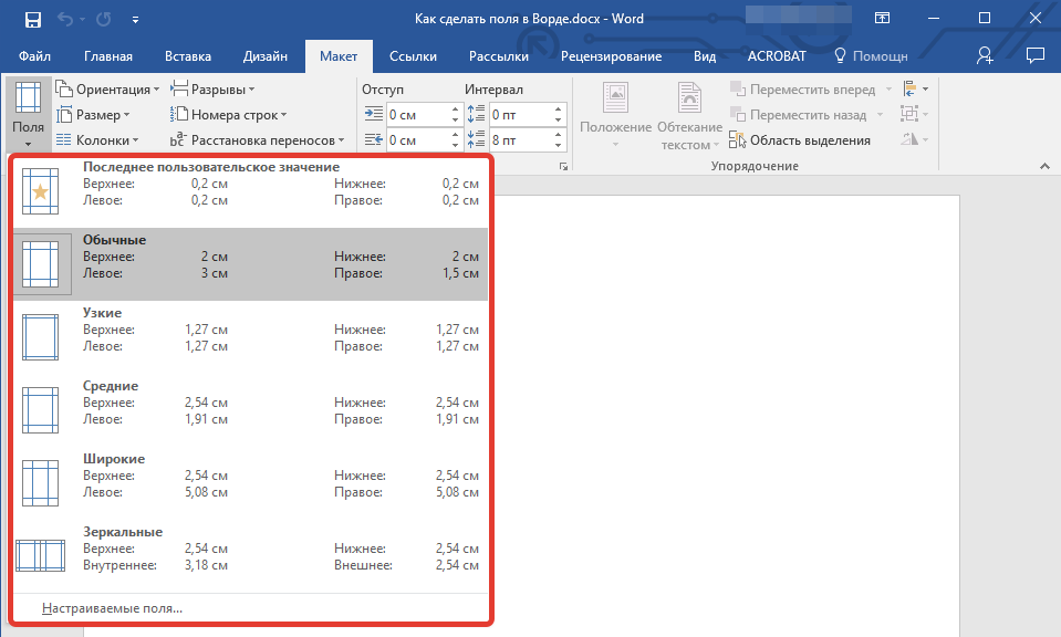 После нажатия кнопки «Поля» откроется список полей стандартного размера. Здесь доступны варианты: обычное, узкое, среднее, широкое и зеркальное поле. Вы также можете выбрать здесь «Недавние настраиваемые поля», которые совпадают с последними пользовательскими настройками, и «Настраиваемые поля», но мы рассмотрим их позже.