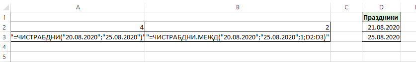 ЧИСТРАБДНИ – функция рассчитывающая количество рабочих дней при пятидневной рабочей неделе. Синтаксис формулы следующий: