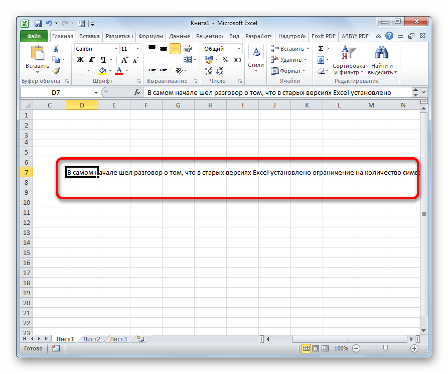 Ограничение количества знаков в ячейке также влияет на отображение текста в ячейке. При превышении этого ограничения текст можно будет увидеть только в строке формул. Это положение справедливо для ячеек формата «Текстовый».