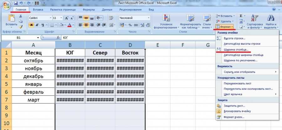 В открытом файле выделяем все столбцы с решетками, затем переводим курсор на верхнюю панель настроек программы эксель, где необходимо активировать закладку «Главная», там отыскиваете с правой стороны блок «Ячейки», в которой находим кнопку «Формат» и нажимаем на неё. Появляется дополнительное меню, в котором нужно активировать строчку «Ширина столбца».