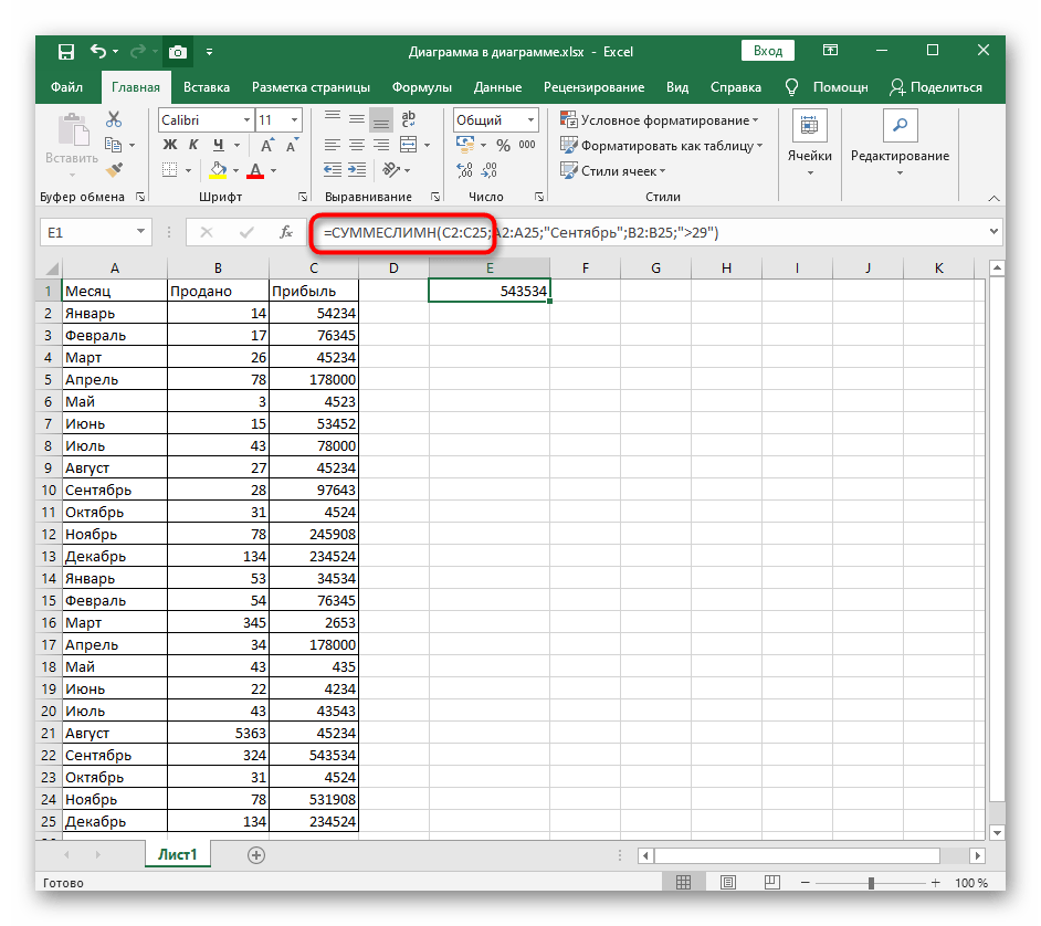 Функция СУММЕСЛИМН в Excel с примером использования в формуле
