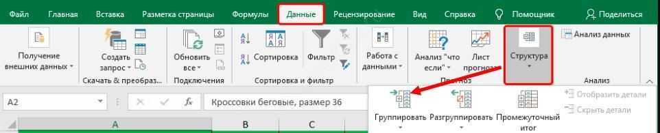 - Войдите в «Данные», а в блоке «Структура» жмите на клавишу «Группировать».