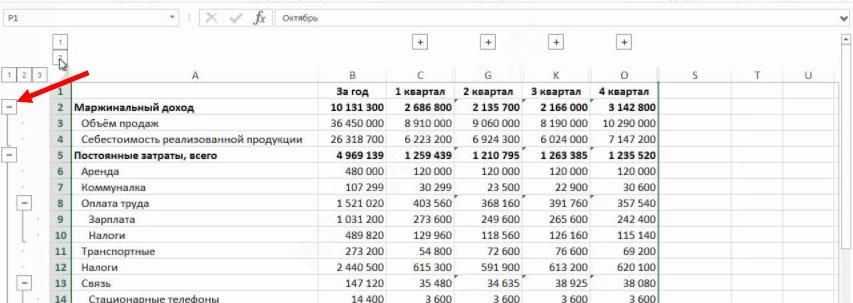- Нажатие на минус скроет столбцы, и «—» превратится в «+«. Нажатие на плюс моментально отобразит все скрытые в этой группе столбцы.
