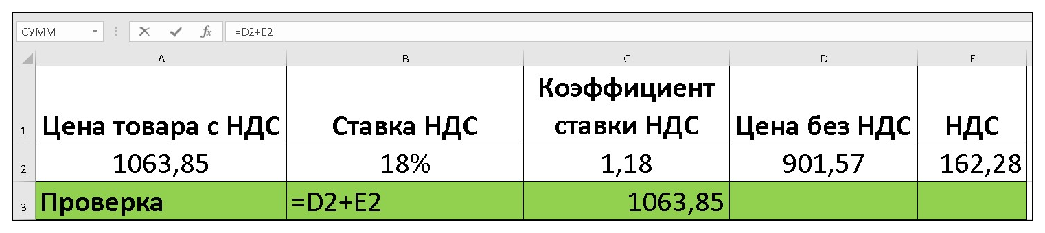 Теперь обязательно проверяем правильность расчета несколькими способами. Складываем цену без НДС и цифру налога: 901,57 + 162,28 = 1063,85 рублей. Второй способ: 901,57 * 1,18 = 1063,85 рублей. Все верно.