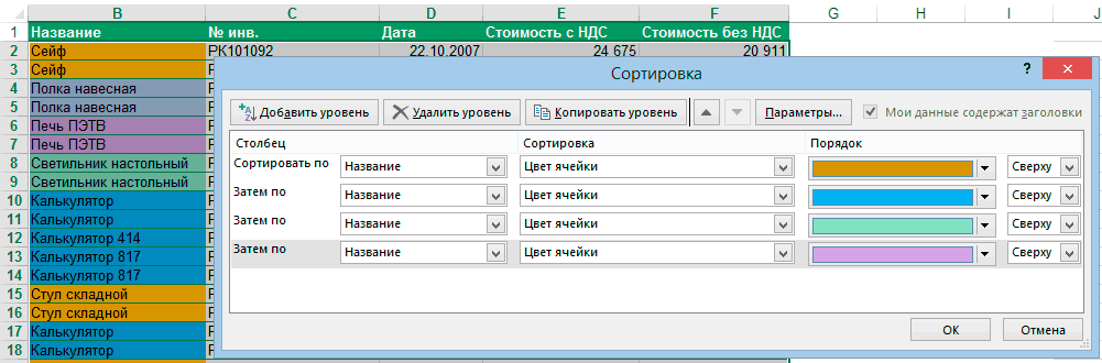 Часто для анализа данных делается заливка ячеек (или шрифта) цветом. С помощью сортировки можно также упорядочивать данные на основе их форматирования.