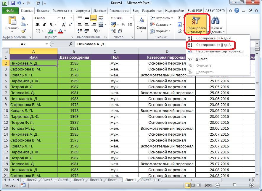 - Чтобы сделать сортировку в обратном порядке, достаточно выбрать «Сортировка от Я до А».