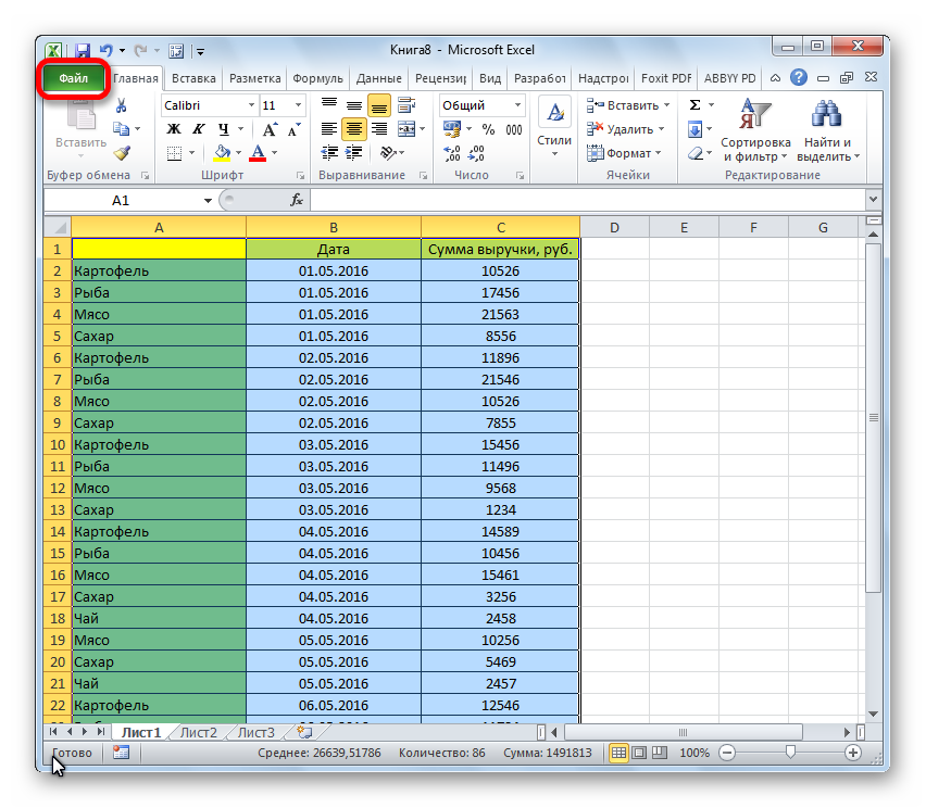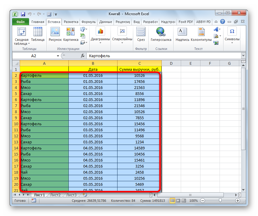Откройте первый рабочий лист Excel, выделите данные, которые нужно отобразить на диаграмме, откройте вкладку Вставка