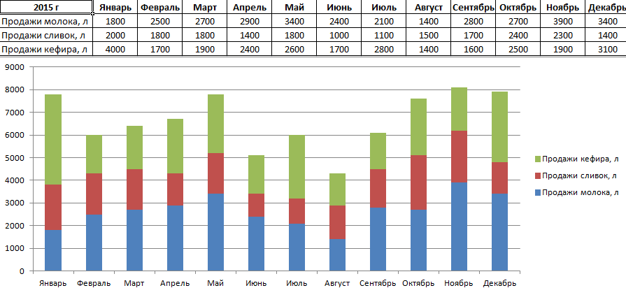 Получаем диаграмму, на которой можно видеть, что, например, в январе больше продано молока, чем кефира или сливок. А в августе, по сравнению с другими молочными продуктами, молока было продано мало. И т.п.