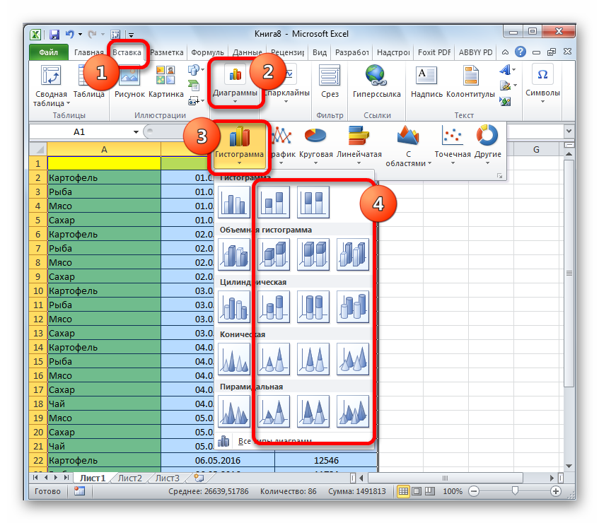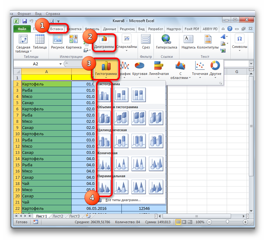 Выделите любую ячейку таблицы (см. файл примера ), на вкладке Вставка , в группе Диаграммы нажмите кнопку Гистограмма , в выпавшем меню выберите Гистограмма с группировкой .