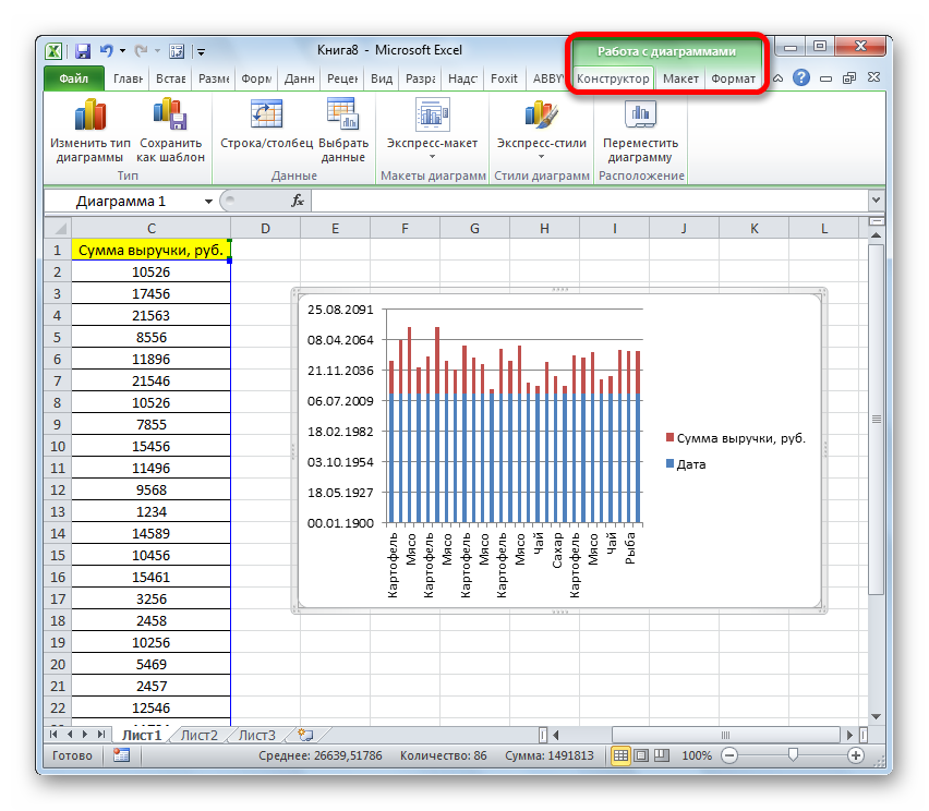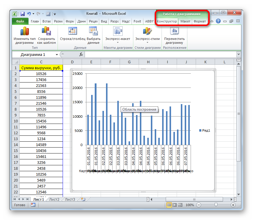 Кликните по только что созданной диаграмме, чтобы на Ленте меню появилась группа вкладок Работа с диаграммами