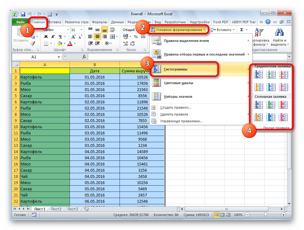 Гистограммы также можно выводить при условном форматировании ячеек.