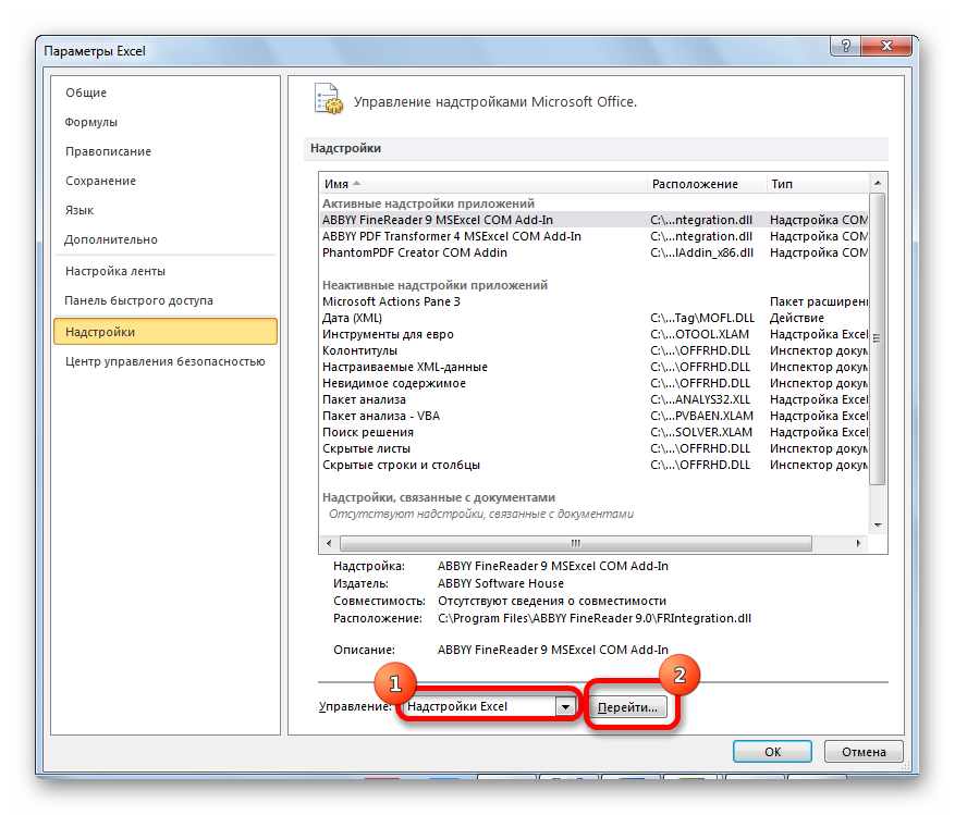 В блоке «Управление» переставляем переключатель в позицию «Надстройки Excel».