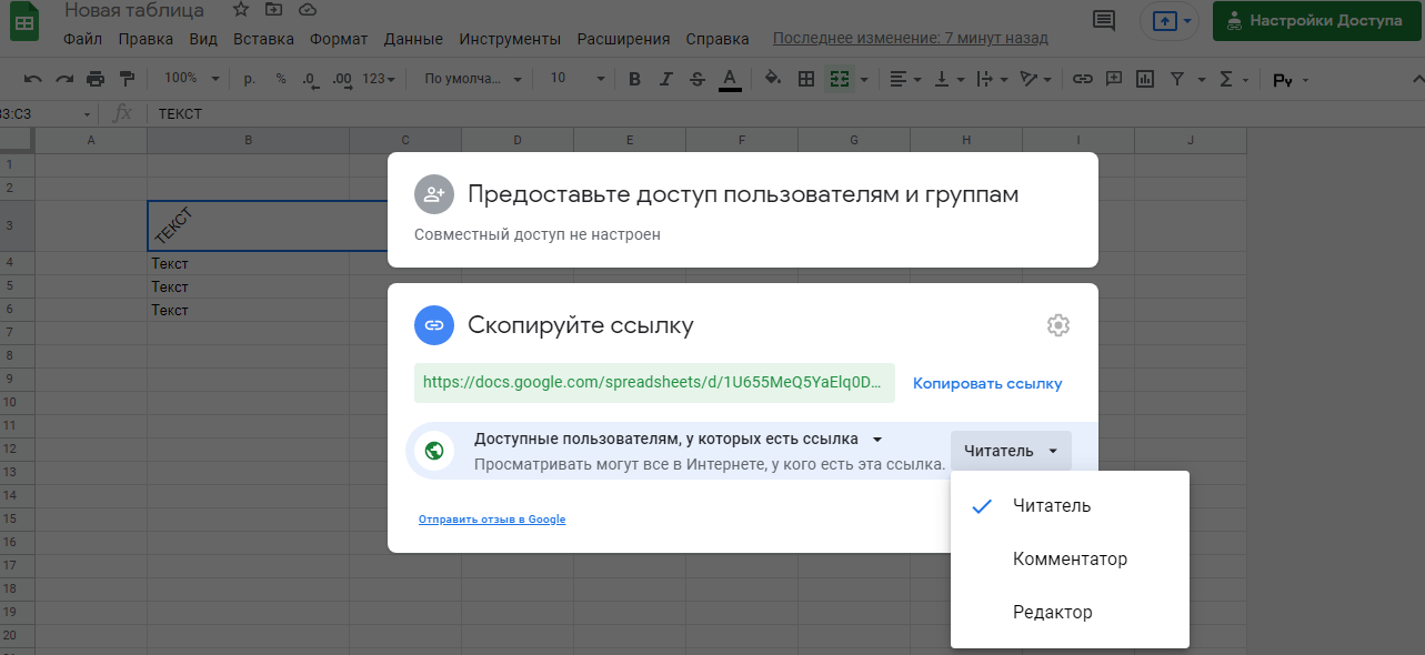 - В форме «Скопируйте ссылку» установите один из трех статусов, в которых указаны разрешения для работы с таблицей;