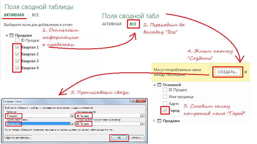 Первое правило сводных таблиц: отношения между таблицами определяются в системе отчетов сводной таблицы, с использованием инструмента Отношения. Не пытайтесь с самого начала определить связи между таблицами – инструмент формирования отчетов сводных таблиц все равно их не воспримет.