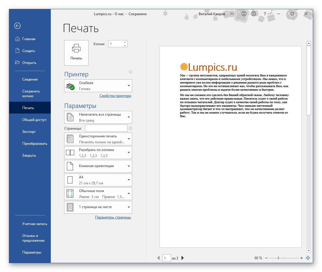 - Перед вами откроются настройки печати, выберите нужный принтер, размер страницы и другие характеристики;