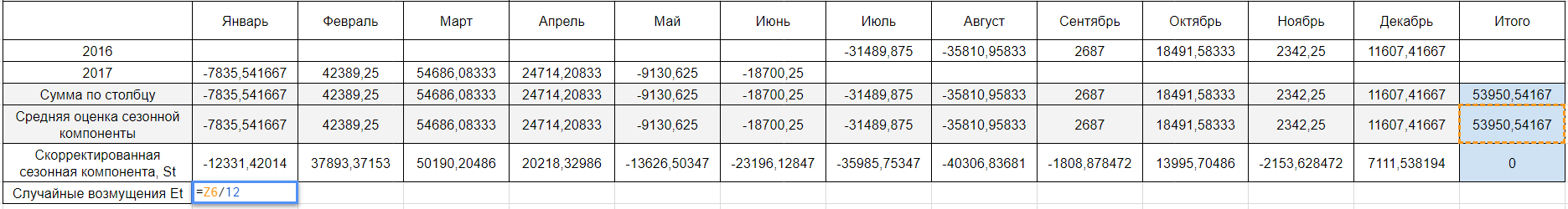 Средняя оценка сезонной компоненты находится как сумма по столбцу, деленная на количество заполненных строк в этом столбце. В нашем случае оценки сезонной составляющей расположились в строках без пересечений, поэтому сумма по столбцам состоит из одиночных значений, следовательно и среднее будет таким же. Если бы мы располагали периодом побольше, например с 2015, у нас бы добавилась еще одна строка и мы смогли бы полноценно найти среднее, поделив сумму на 2.